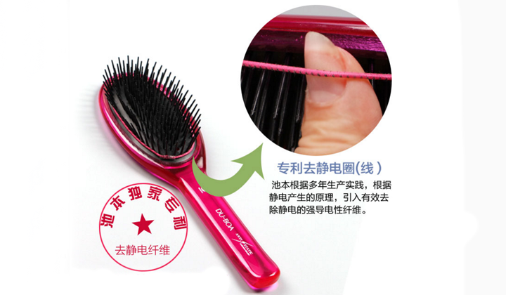 1、池本擁有防靜電獨家專利——去靜電纖維,同時擁有氣囊設(shè)計,可以有效防靜電,頭皮按摩。